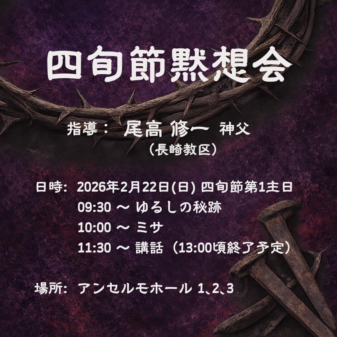 指導: 尾髙 修一 神父(長崎教区)日時: 2026年2月22日(日) 四旬節第1主日 09:30 ~ ゆるしの秘跡 10:00 ~ ミサ 11:30 ~ 講話(13:00頃終了予定)場所: アンセルモホール 1、2、3 View this post on Instagram